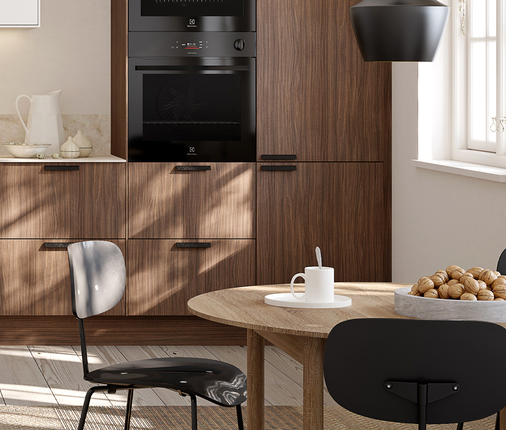 Kombiner tremønstrede laminatfronter med aksentfronter i serien Prosjekt i lyse toner for å dempe ned en livlig trefront. Alpin hvit, Hvit, Elfenben matt og Sand.