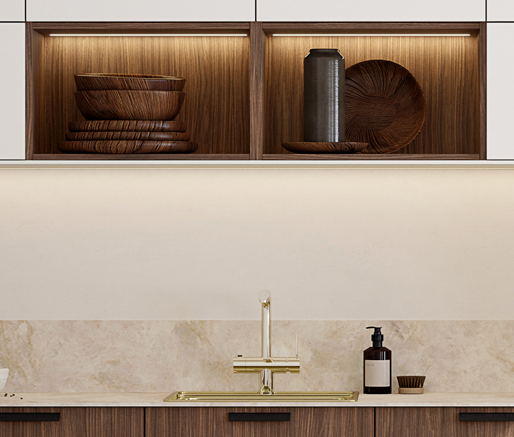 En benkeplate i kvartskompositt med varme nyanser. Benkeplate Proteus.